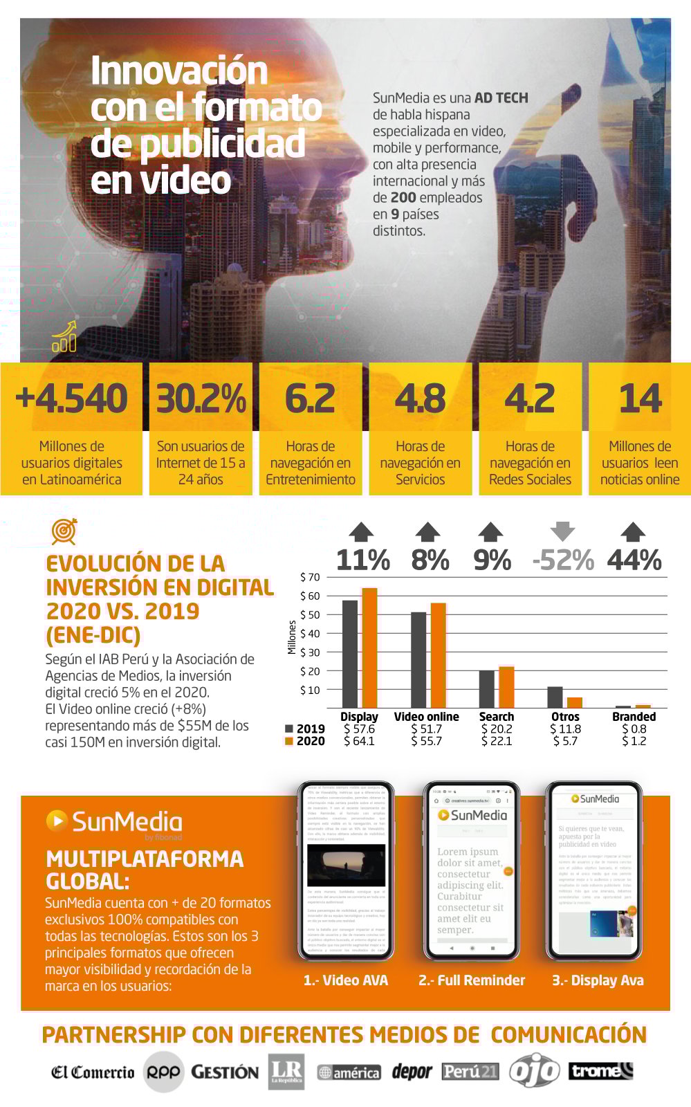 Según el IAB la inversión digital creció 5% en el 2020 y uno de los formatos que más destacó fue el Video online (+8%). En este sentido, una de las marcas que se está posicionando en Perú con esta innovación de publicidad en video es SunMedia, una AD TECHde habla hispana especializada en video, mobile y performance, con alta presencia internacional y más de 200 empleados en 9 países distintos.