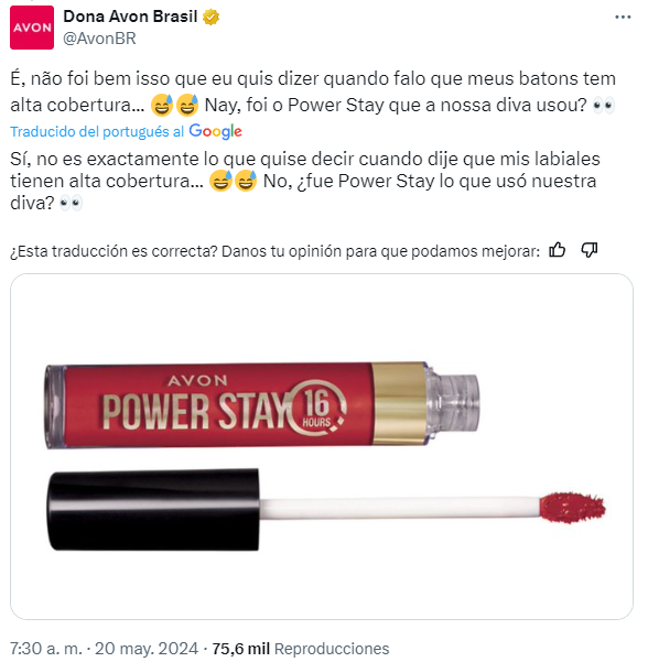 Por eso, la pregunta generalizada de los usuarios fue: ¿de qué marca proviene ese labial tan resistente? Y aquí es donde la historia se torna interesante para los profesionales de marketing. La madre solo señaló que era marca Avon arrobando a la marca. Sin embargo, el/la community manager de Avon hizo lo suyo dando el nombre exacto de un producto cuya característica principal es durar intacto hasta por 16 horas.