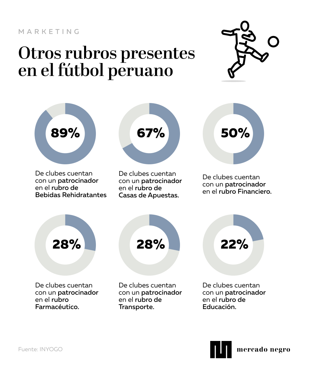 Las instituciones deportivas del mundo poseen diversos patrocinadores de distintos rubros, los cuales según el periodista Luis Carrillo Pinto, responden a un contrato por derechos de imagen y a una relación a largo plazo con un club. El mercado peruano no es ajeno a estas estrategias y cada vez más compañías encuentran en el fútbol un espacio para generar un gran impacto acorde al perfil de los consumidores.
