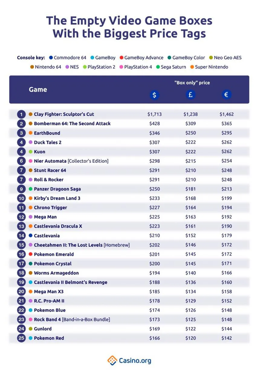 Es así como según este estudio, la caja vacía más valiosa es la del juego ClayFighter: Sculptor’s Cut de Nintendo 64 que puede alcanzar un valor de superior a los 1.500 dólares. Esto se debe a que este juego solo se vendió como alquiler exclusivo en las tiendas Blockbuster Video.