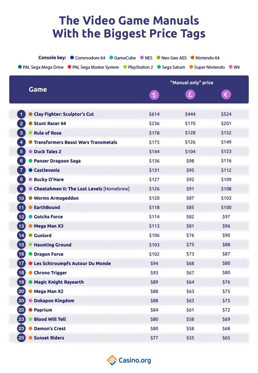 El manual de este título también es el más caro y podría costar en este mercado más de 500 dólares. En los ranking que puedes ver a continuación se detalla el resto de los lugares para ambas categorías.