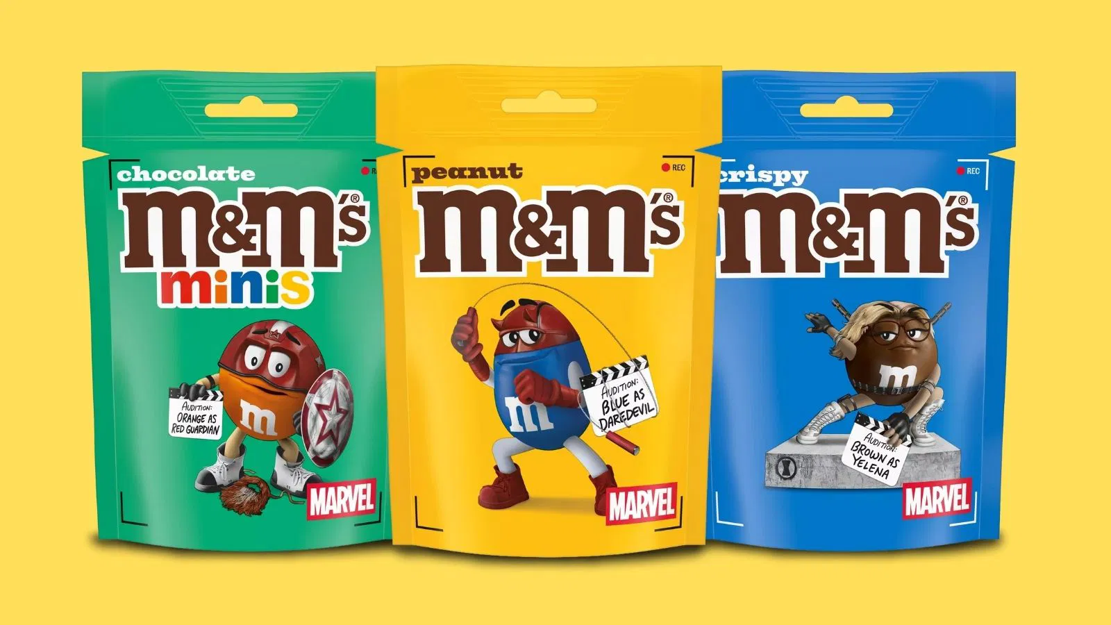 La colaboración se extiende a los pasillos de dulces mediante siete paquetes de edición limitada de M&M’S x Marvel. Las combinaciones incluyen: Amarillo como Wolverine, Rojo como Deadpool, Azul como Daredevil, Púrpura como Elektra, Verde como She-Hulk, Marrón como Yelena y Naranja como Guardián Rojo.