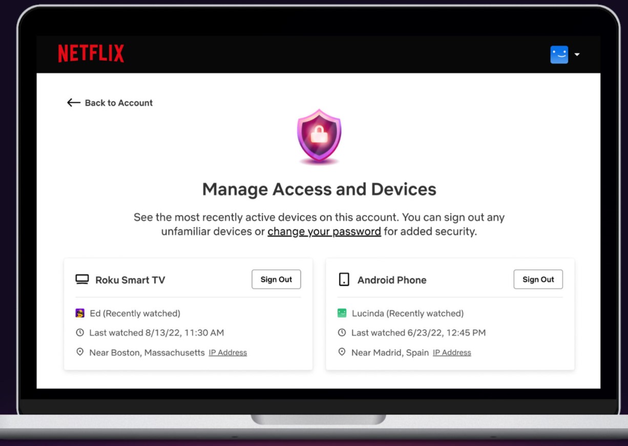 De acuerdo con una publicación de blog reciente de la compañía, la nueva herramienta para los suscriptores se llamará ‘Administrar acceso y dispositivos’. Con ella se podrá ver qué dispositivos han utilizado la cuenta de un usuario y cerrar sesión con tan solo un clic.