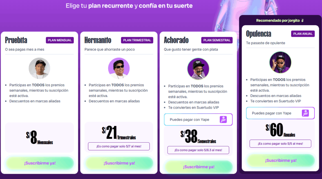 El popular comediante de ‘Hablando Huevadas’, Jorge Luna, creó “No Hay Sin Suerte” en 2023. Una plataforma que funciona bajo un modelo de suscripción que permite a los usuarios participar en sorteos, promociones y experiencias digitales.