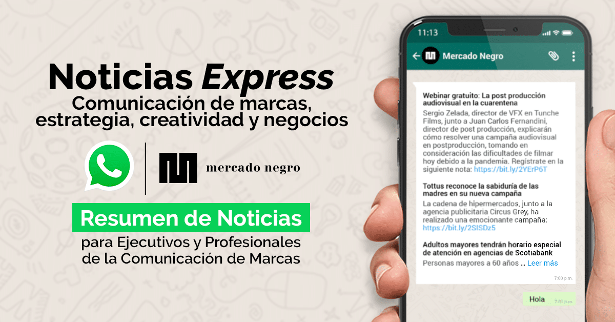 Mercado Negro, medio de comunicación líder de la industria, presentó recientemente su nuevo servicio ‘Noticias Express’, un resumen de noticias enviado vía Whatsapp, diseñado para aligerar el poco tiempo que tienen los profesionales de la comunicación de marcas, estrategia, creatividad y negocios, y así mantenerlos informados diariamente con las noticias más resaltantes.