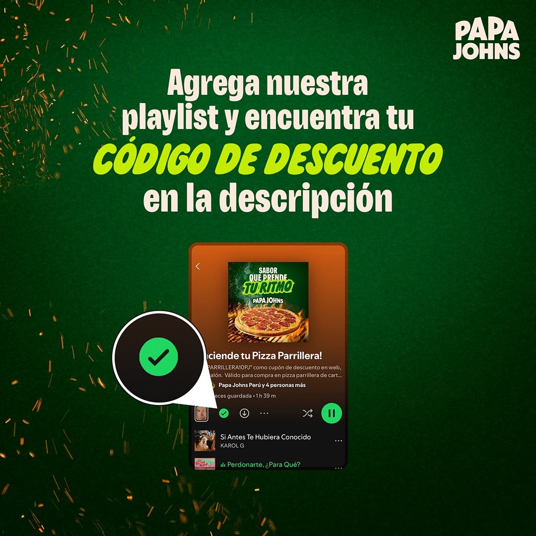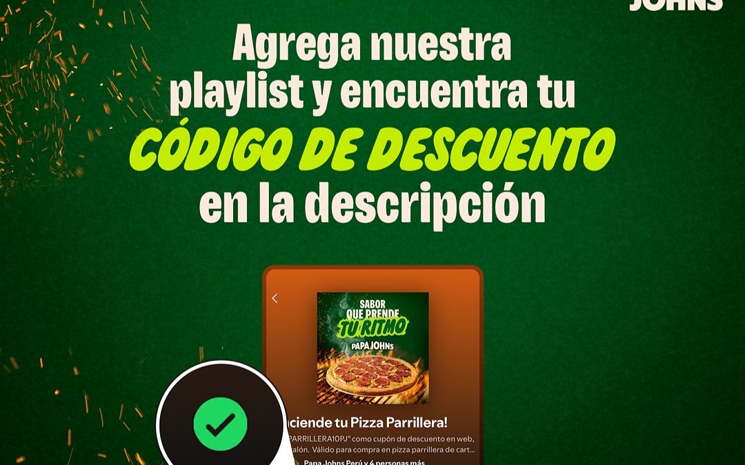 Al suscribirse a la playlist, los usuarios encontrarán en la descripción un código promocional que les permitirá obtener S/20 de descuento en la compra de una pizza parrillera grande o familiar en cualquier tienda Papa John’s, en la web o a través de su call center.