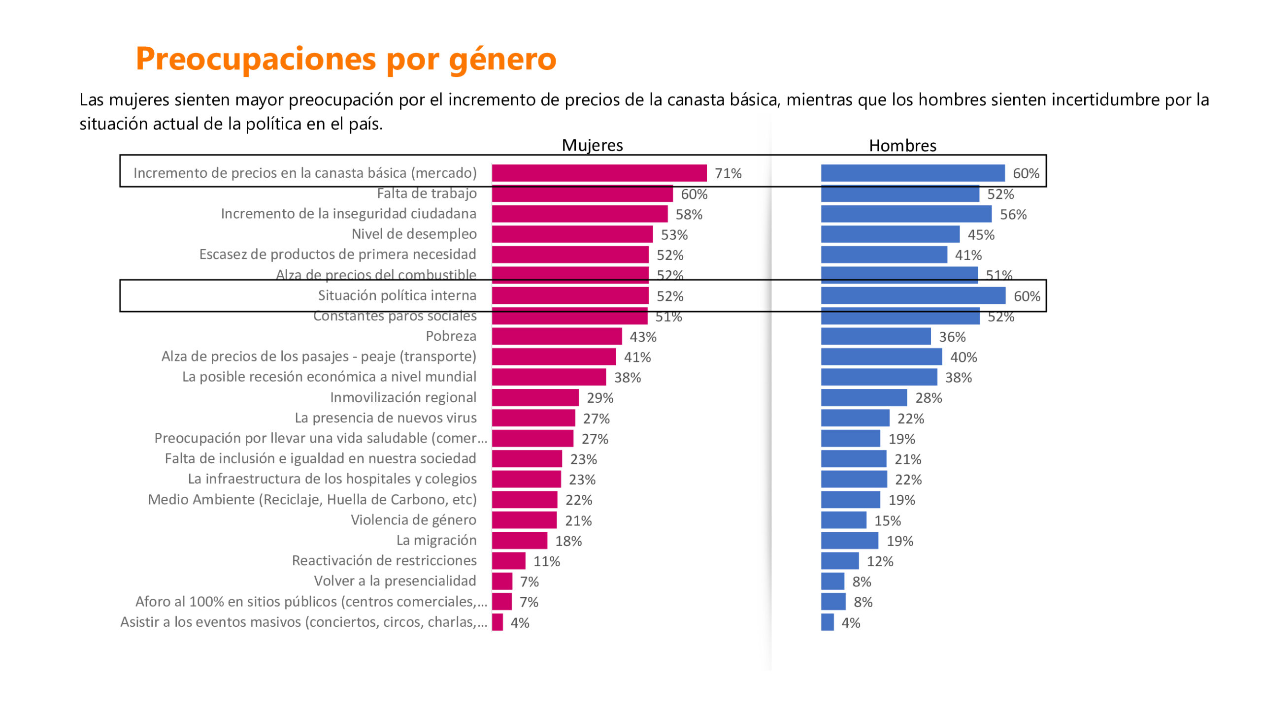 Mientras que el 71% de peruanas está preocupada por el incremento de la canasta básica, la cifra cae hasta 60% respecto a los hombres. Las mujeres también están más consternadas por la falta de trabajo, el incremento de la inseguridad ciudadana y la pobreza, según el informe “Ola III: 514 Peruanas Dicen” realizado por Omnicom Media Group (OMG).