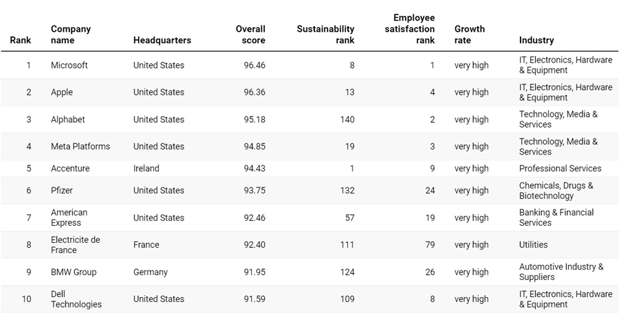 La empresa líder en la lista es Microsoft, que registró ganancias de US$72.000 millones, lo que representa un aumento del 63% en comparación con el año 2020, y logró reducir sus emisiones generales en un 0,5%. En su último informe anual, Microsoft destacó que en Estados Unidos, tanto los empleados pertenecientes a minorías raciales y étnicas como las mujeres tenían un salario promedio superior al de sus contrapartes masculinas. El director ejecutivo de la gigante tecnológica, Satya Nadella, afirmó: «En mi opinión, nuestra misión consiste en empoderar a todas las personas y organizaciones del planeta para que puedan lograr más».