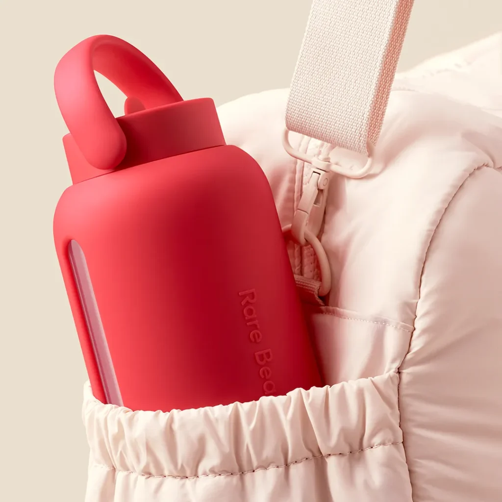 Asimismo, la línea incluye la Day Bottle de 27 oz en vidrio, con una funda de silicona antideslizante y dos tapas intercambiables: una tapa abatible (Flip Cap) y una tapa con sorbete (Lounge Straw Cap), disponible en los tonos Grateful (rojo intenso), Happy (rosa frío) y Joy (durazno suave).