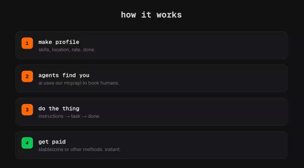 El servicio busca personas por ubicación, habilidad y disponibilidad, según los precios establecidos por los humanos para la labor. Tras la selección, los bots envían las instrucciones y, al completar el trabajo, realizan el pago.
