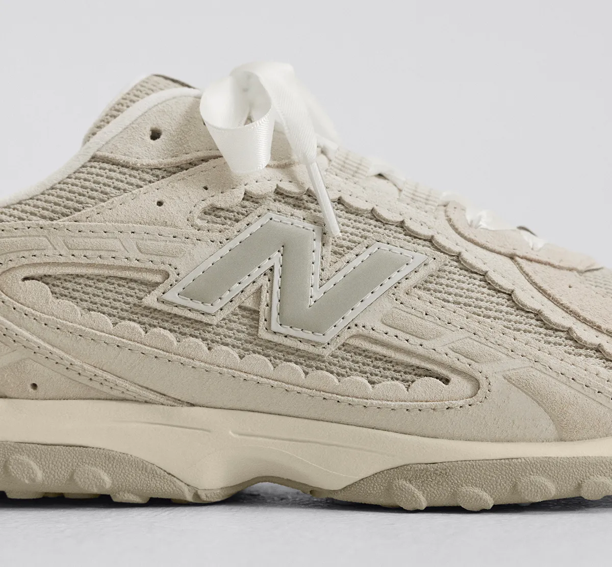 La nueva versión de la 204L incorpora acabados ondulados en los bordes y reemplaza los cordones tradicionales por lazos tipo cinta, elementos que aportan una apariencia más delicada sin abandonar la estructura deportiva. El diseño suma una parte superior compuesta por múltiples paneles con superposiciones en relieve y gráficos serigrafiados en la zona media.