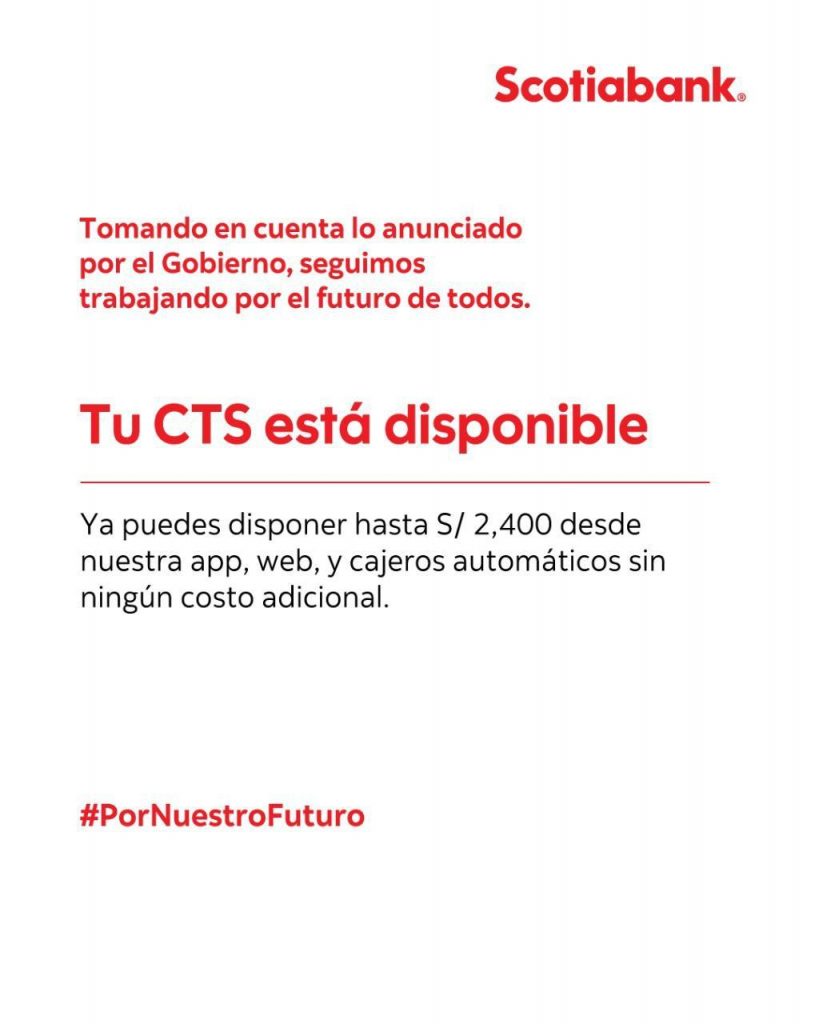 “Tu CTS ya está disponible. Ya puedes disponer hasta S/ 2400 soles desde nuestra app, web y cajeros automáticos sin ningún costo adicional”, dice el comunicado publicado en las redes sociales del banco.