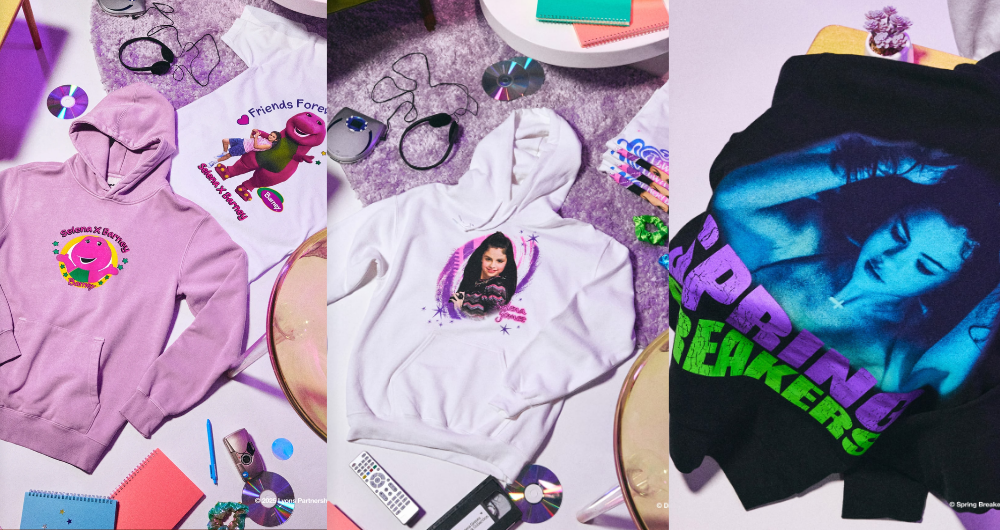 La colección de 11 piezas incluye polos, hoodies, tank tops y joggers que repasan tres capítulos de la vida artística de Gomez. La primera parada es Barney y sus amigos (2002-2004), donde debutó en televisión con apenas 10 años. Desde ahí se pasa a Los hechiceros de Waverly Place (2007-2012), serie que la consolidó como estrella juvenil de Disney. Finalmente, el recorrido culmina en Spring Breakers (2013), la película que marcó su paso hacia un perfil más adulto y atrevido en la pantalla grande.