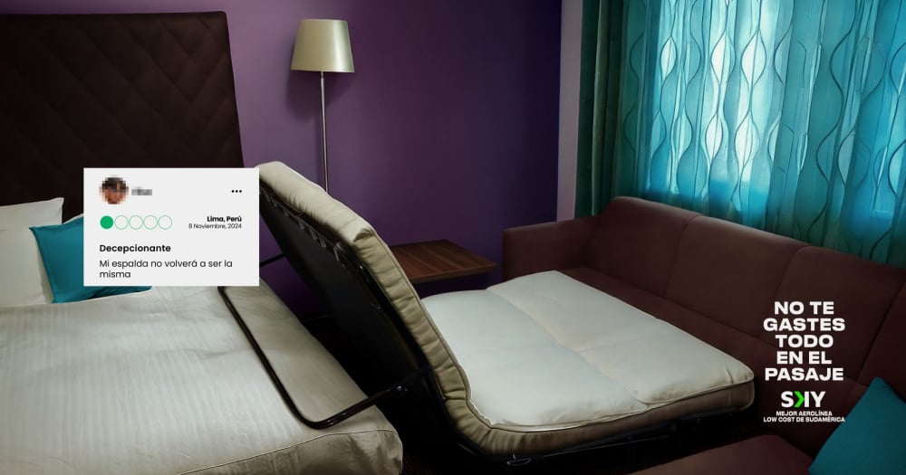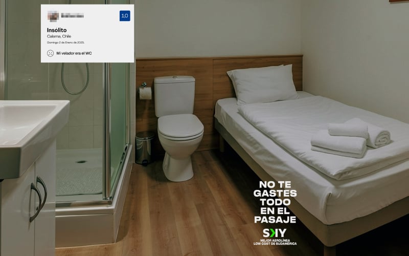 Para ello, Sky Airline comparte una serie de fotografías que ejemplifican las habitaciones en las que uno está expuesto a dormir debido a que gastó de más en los pasajes. Desde un cuarto, cuya ventana está pegada a un muro, hasta uno que también es un baño.
