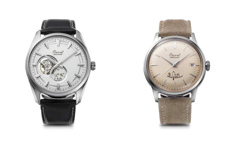 Las ediciones limitadas de Orient incluyen una ilustración especial: Snoopy recostado con Woodstock y una corona dorada, aludiendo al emblema de los leones enfrentados de la marca.