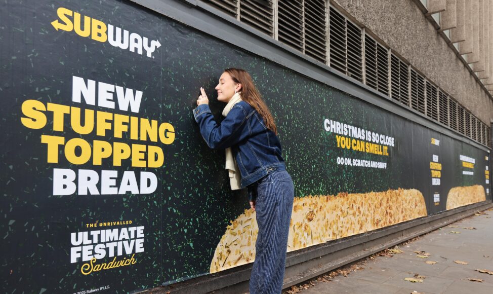 Esta acción de marketing sensorial presenta un cartel publicitario que, al frotarse, emite el olor del pan relleno de salvia y cebolla de Subway.