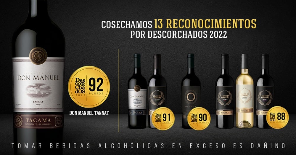 Algunos vinos de Tacama que Patricio Tapia cató, puntuó e incorporó en Descorchados 2022 son Don Manuel Tannat (92 puntos), Don Manuel Petit Verdot (91 puntos), Selección Especial Petit Verdot (91 puntos), Selección Especial Carménère (88 puntos), Selección Especial Malbec (88 puntos), “O” Malbec (90 puntos), Blanco de Blancos Sauvignon Blanc (88 puntos), Blanco de Blancos Sauvignon Blanc-Chardonnay-Viognier (86 puntos), Gran Tinto Malbec-Tannat-Petit Verdot (87 puntos), Gran Tinto Crianza Malbec (86 puntos) y Gran Blanco Sauvignon Blanc-Chardonnay-Chenin Blanc (86 puntos). De esta manera, Tacama se convierte en la viña del Perú con más productos calificados.