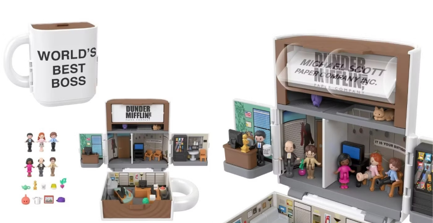 El set compacto, con la forma de la taza de Michael que dice “World’s Bests Boss”, incluye seis muñecos y nueve accesorios que pueden ser colocados en seis distintos lugares.