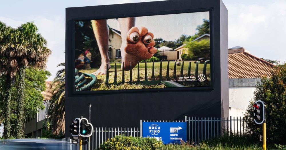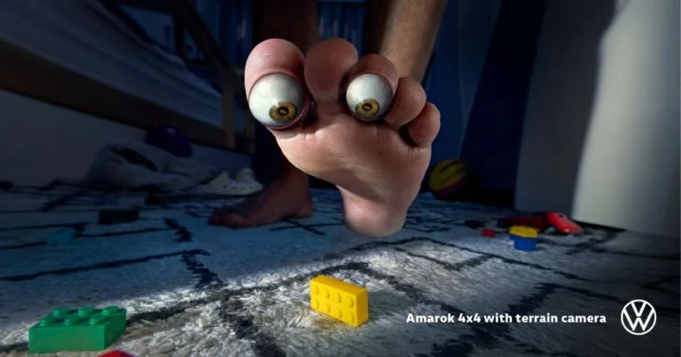 La campaña OHH del Volkswagen Amarok utiliza imágenes disruptivas de pies con ojos para representar su sistema de visión bajo el vehículo sin mostrar el producto. La marca apuesta por una narrativa visual que destaca por romper con la estética clásica de la publicidad automotriz.