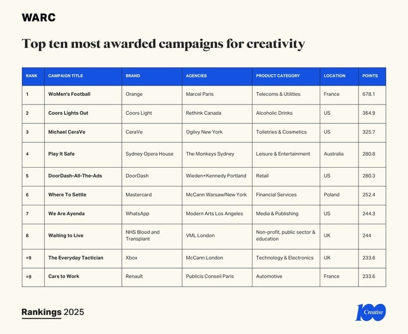 El ranking WARC Creative 100 2025 ofrece una visión clara del impacto de la creatividad en la industria publicitaria global y establece un punto de referencia para el futuro de la comunicación de marca. Puedes ingresar al siguiente enlace para ver la lista completa.