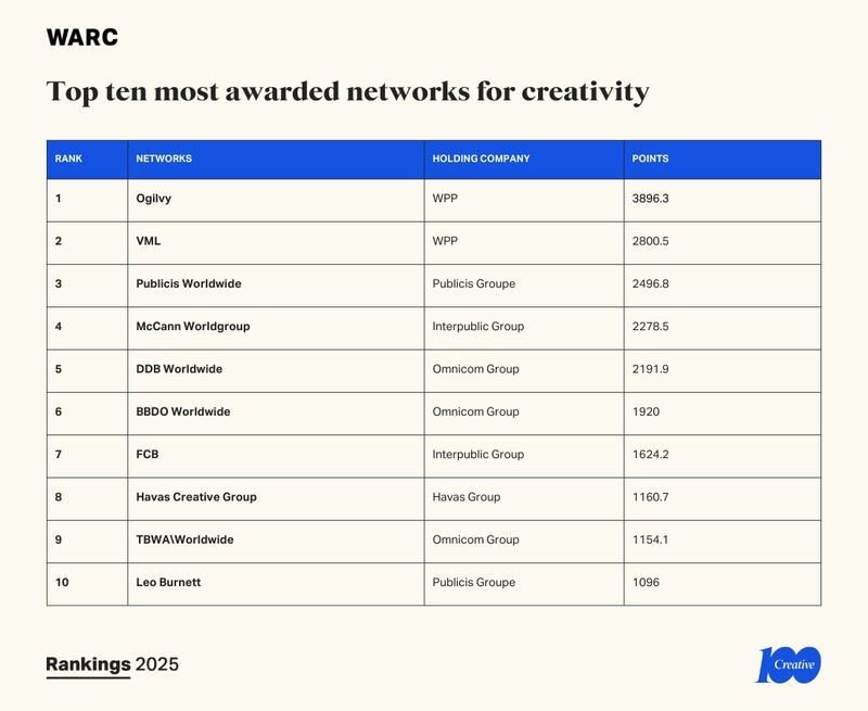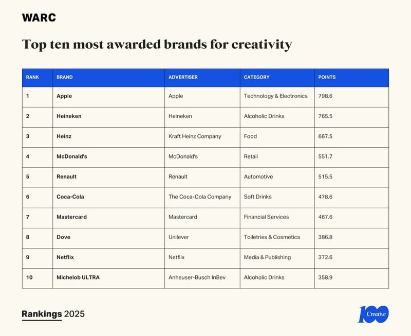 El ranking WARC Creative 100 ya está disponible, consolidándose como la referencia global de las campañas y empresas más premiadas por su creatividad. Elaborado por WARC Creative, este ranking anual recopila los resultados de los principales premios creativos globales y regionales de 2024. Su selección se basa en la consulta con el Consejo Asesor de Clasificaciones WARC y en una encuesta anual a un panel de expertos de la industria.