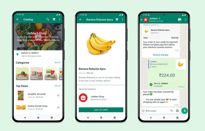 Revisar los productos del catálogo, añadirlos al carrito de compra y pagar será posible desde WhatsApp en India; es decir, todo el proceso e-commerce. La función es posible gracias a una alianza con las empresas Jio Platforms y Reliance Retail, empresa en la que Meta invirtió más de 5.5 millones de dólares en 2020.