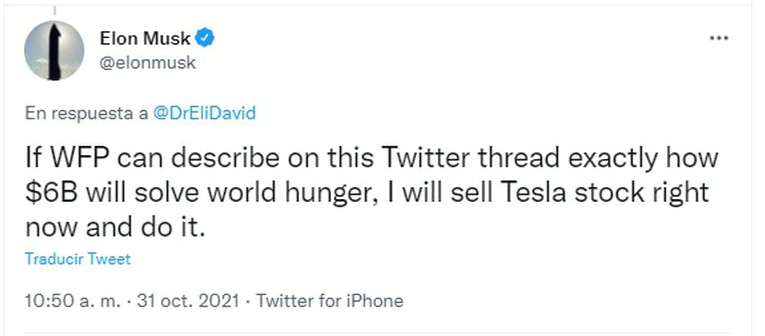Musk no dudó en pronunciarse al respecto, y por medio de un tweet afirmó: «Si el WFP puede describir en este hilo de Twitter exactamente cómo 6 millones de dólares resolverán el hambre en el mundo, venderé las acciones de Tesla ahora mismo y lo haré».