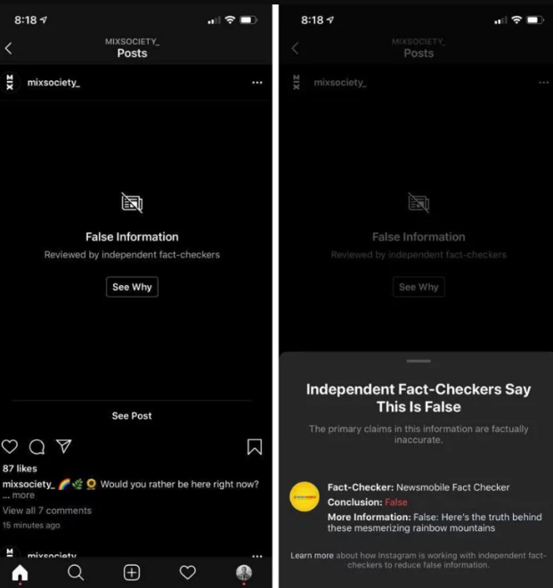 Según la información difundida por diversos medios internacionales, se trataría de un esfuerzo por combatir la desinformación y las “fake news”. En este sentido, Instagram, lanzó la nueva característica que por medio de un algoritmo señala o identifica imágenes falsas. Medida que hasta la fecha ha causado malestar por ciertos usuarios, en especial fotógrafos.