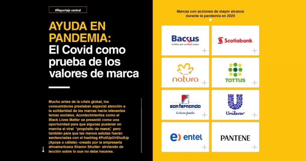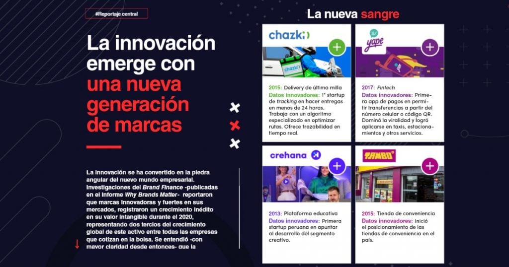 Un extenso trabajo infográfico recibe al lector y lo lleva a recorrer la historia de las marcas más antiguas del mercado y, con ellas, la propia historia del Perú. Así, los usuarios se adentran a un rico contenido visual que abre paso a las marcas de «La nueva sangre» -aquellas que destacan en el acontecer actual del país- y a una completa «Radiografía de marcas«, que habla sobre aquellas de mayor: consumo, creatividad, cultura corporativa, sostenibilidad y más.