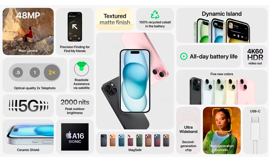 Las características incluyen una gama de colores en tonos claros, tamaños de pantalla de 6.1 pulgadas para el iPhone 15 y 6.7 pulgadas para el iPhone 15 Plus. Además, el iPhone 15 presenta la «isla dinámica» en lugar del notch, que permite mostrar dos notificaciones a la vez y otras funciones útiles. La pantalla Super Retina XDR ofrece un brillo máximo de 2,000 nits, protegida por un «escudo cerámico» para mayor durabilidad.