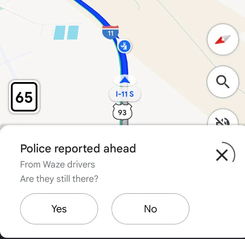 Al navegar, los usuarios recibirán alertas emergentes con datos como «Información de policía» y la opción de confirmar o ignorar. También podrán informar manualmente sobre accidentes, radares, tráfico o trabajos en la vía, usando el icono de escudo o el botón de reporte.