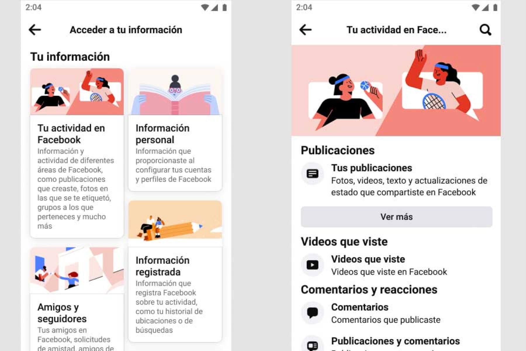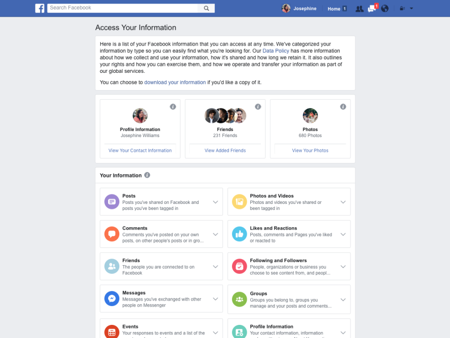 La sección «Acceder a tu información» está organizada en 8 categorías para descargar o borrar datos y mejorar su experiencia en la red social