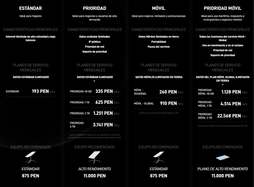 Además, Starlink ofrece un plan prioritario, ideal para empresas y usuarios con altas demandas de datos. Los planes de datos prioritarios varían desde 40GB a 6TB, con tarifas que oscilan entre 335 y 3,741 soles mensuales. El plan de 6TB requiere una antena de alto rendimiento, que tiene un costo de 11 mil soles.