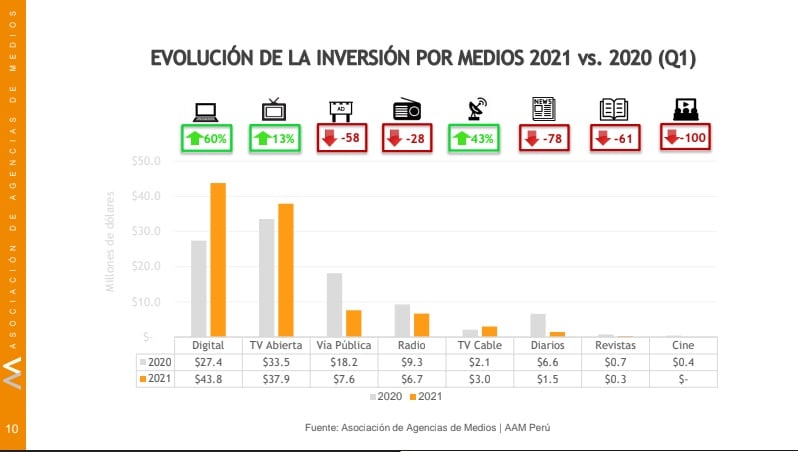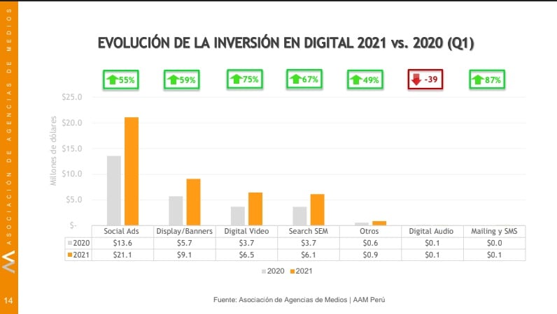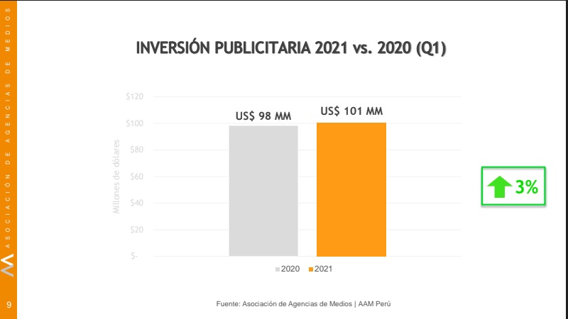 La Asociación de Agencias de Medios (AAM Perú) publicó su informe Barómetro 2021 en el cual compara la inversión publicitaria en el país durante en el primer trimestre de este año con el mismo periodo en 2020 y reporta un crecimiento global del 3% además de un incremento inédito en el canal digital del 60%.