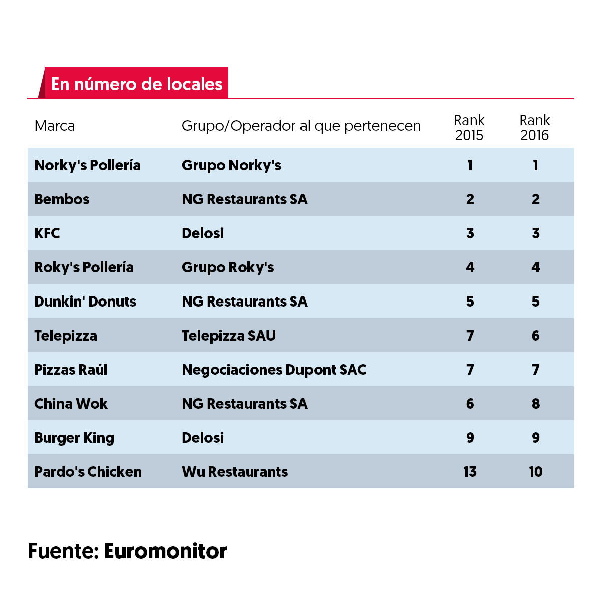 En el ranking que realizó la consultora, la marca peruana Norky’s es la que lidera la lista, con sus 41 años en el mercado. Entre la cuota en ventas totales de los restaurantes tuvo un 12% en Lima al cierre del año 2016.