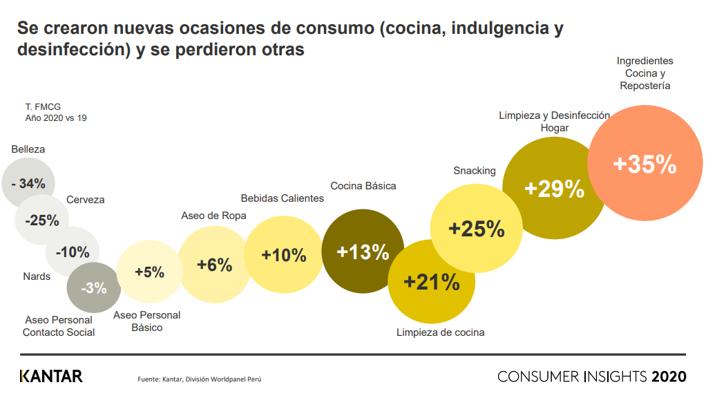 La pandemia también contribuyó a la creación de nuevas «ocasiones de consumo» debido al tiempo extra en casa. Es así como crecieron categorías como los ingredientes de cocina y repostería (+35%), limpieza y desinfección (+29%) y snaking (+25%); y decrecieron momentos como belleza (-34%).