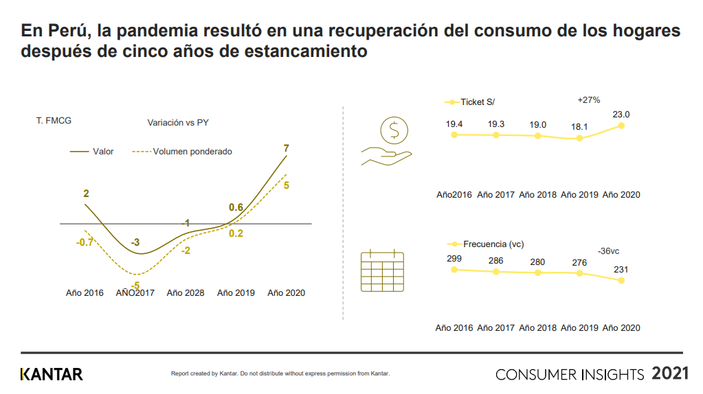 Kantar mostró que el ticket promedio pasó de ser 18,1 soles en 2019 a 23 soles en 2020. La elevación del gasto fue de la mano con un bajón en la frecuencia de compras, esto lógicamente influido por las restricciones de movilidad impuestas por la pandemia.