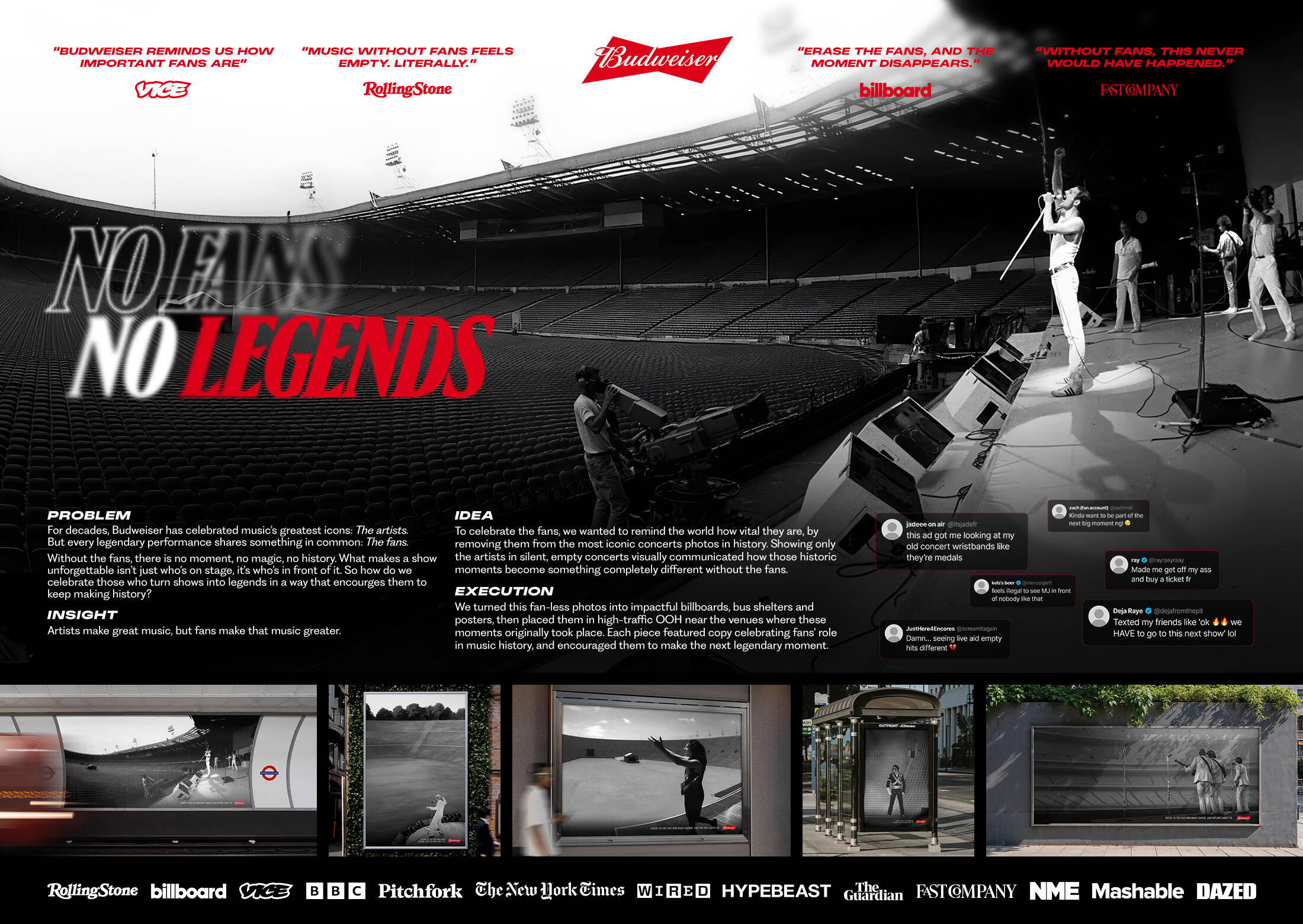 La famosa marca de cerveza lanzó la campaña «Sin fans. No hay leyendas.» para resaltar la importancia de los fans en la música. Según la descripción oficial de la campaña en Ads of the World, la marca ha celebrado durante décadas a los íconos musicales, pero quiso enfocarse en las personas que convierten un concierto en un momento histórico y a los artistas en leyendas.