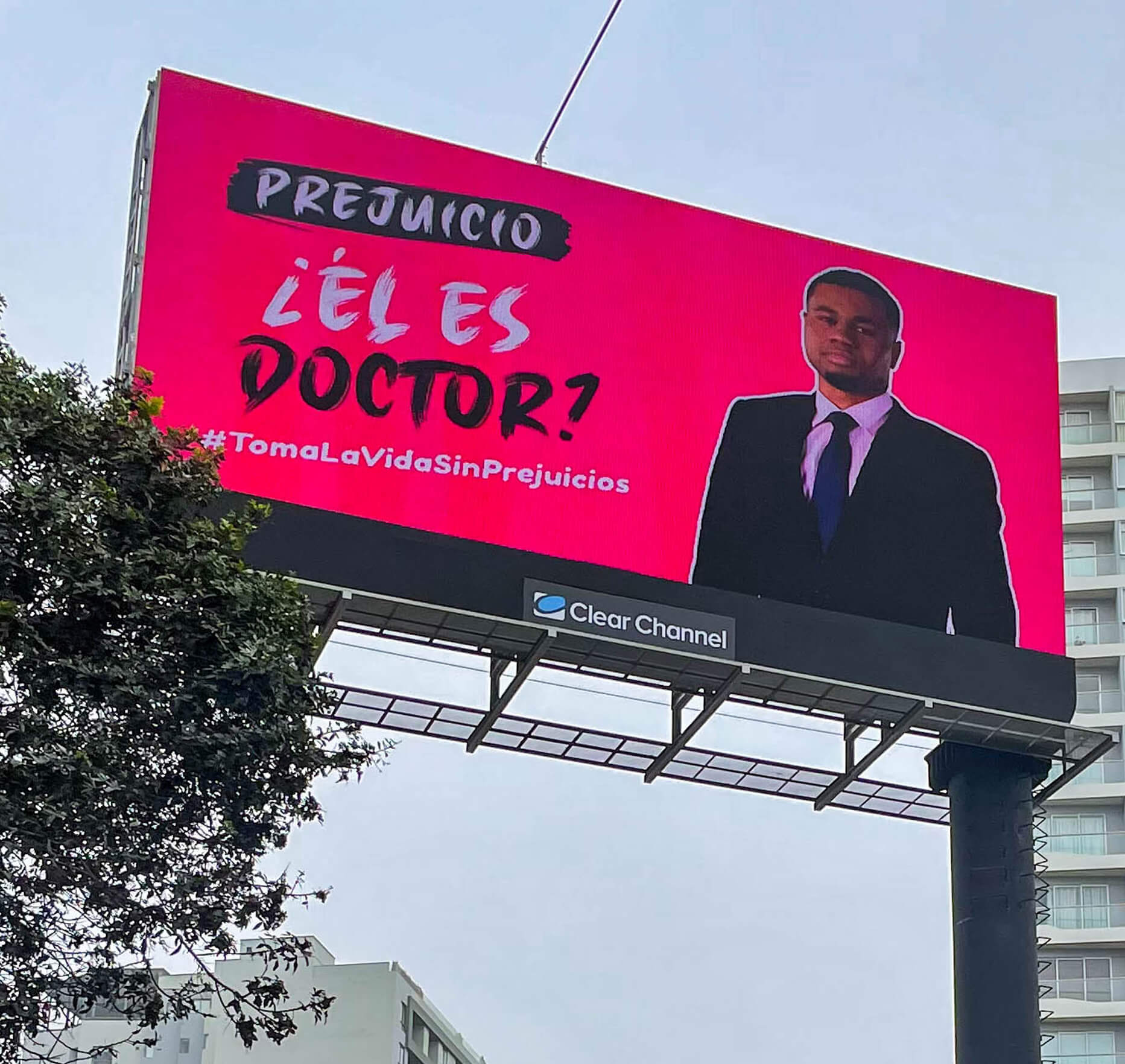 Una de las vallas publicitarias tiene la imagen de un joven afroperuano vestido con un terno con la pregunta “¿Él es doctor?”, aludiendo al prejuicio de que estas personas son identificadas como mejores bailarines o cocineros que como abogados o maestros.