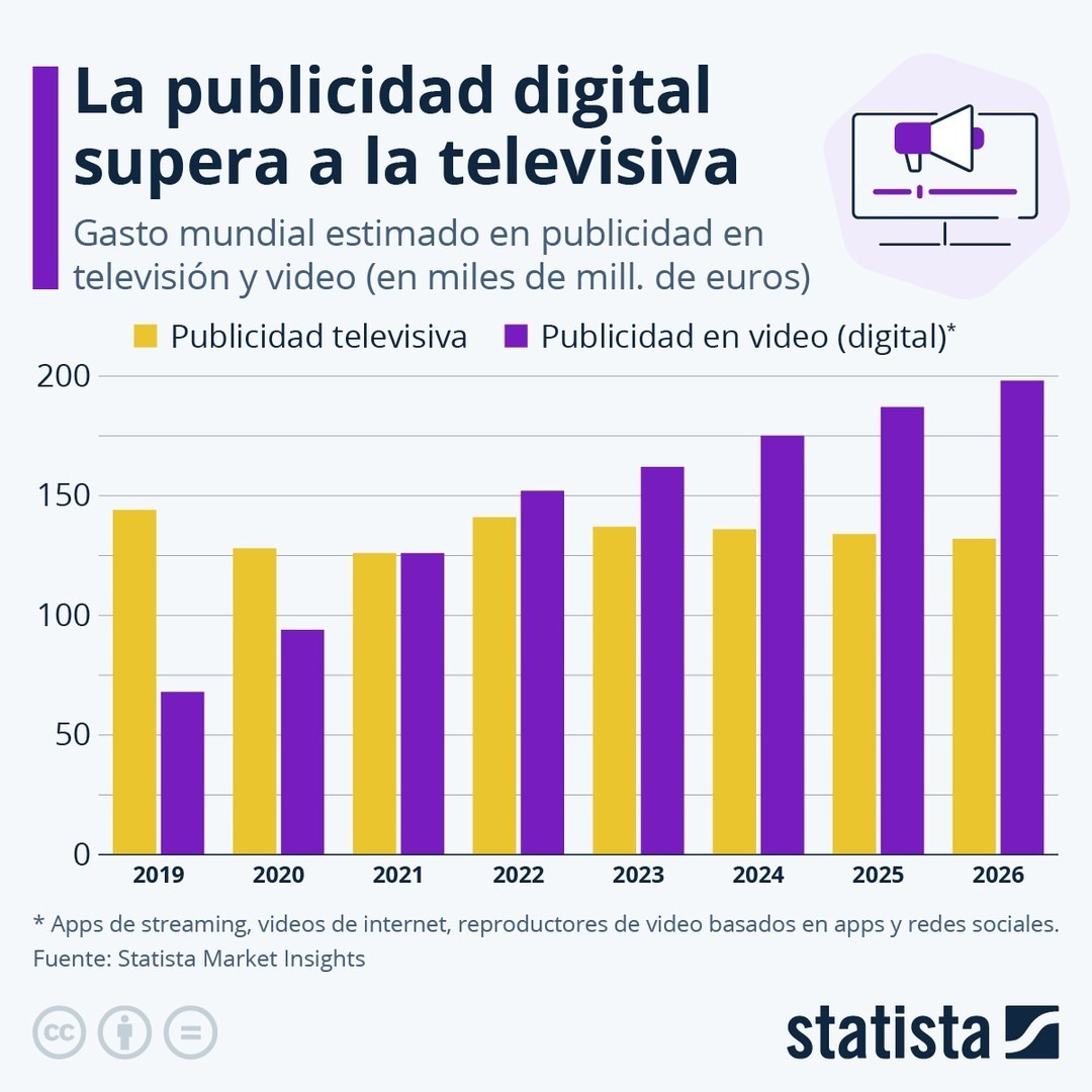 El mercado global de publicidad en formatos de video se está alejando cada vez más de la televisión hacia formatos de video digital como el streaming o las redes sociales. Así lo muestra la estimación actual de Statista Market Insights. Como resultado, la inversión en publicidad en video digital superó por primera vez a la publicidad en televisión en 2022, y se espera que la brecha entre los dos mercados siga creciendo en los próximos años.