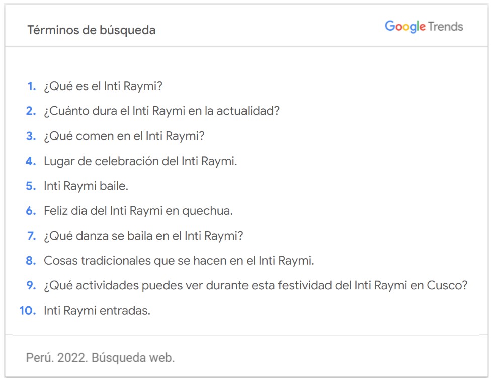 Y entre las preguntas que se hacen los internautas sobre esta festividad, Google Trends revela que la mayoría gira en torno a qué es y las costumbres que se realizan en torno de esta fiesta, además de las actividades que se pueden realizar en la ciudad del Cusco y la compra de entradas para ver el espectáculo de escenificación de la ceremonia inca.