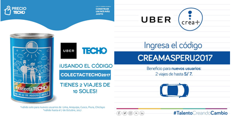 La campaña con Techo es similar. Cada nuevo usuario que ingrese el código COLECTATECHO2017, recibirá dos viajes de hasta S/ 10.00 a ser utilizados sin límite de tiempo. Por cada código activado, Uber donará S/ 10.00 para que Techo continúe en su misión de superar la situación de pobreza que viven miles de personas en asentamientos precarios. La campaña finaliza el 1 de octubre.