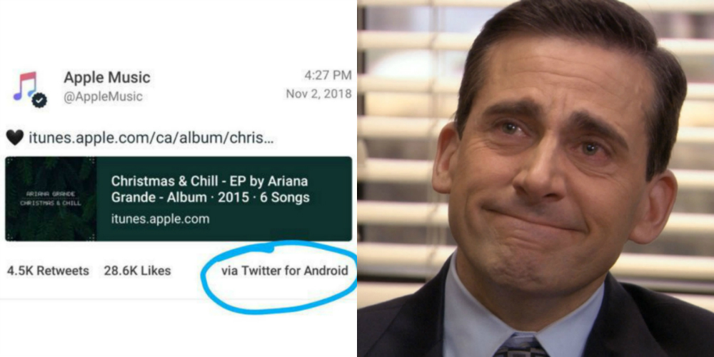 Y es que a inicios de noviembre, la cantante Ariana Grande publicó un tuit promocionando su EP Christmas & Chill, a lo que la cuenta de Apple Music respondió con un link del álbum. Pero lo que nadie notó fue que esa respuesta fue enviada desde un dispositivo Android.