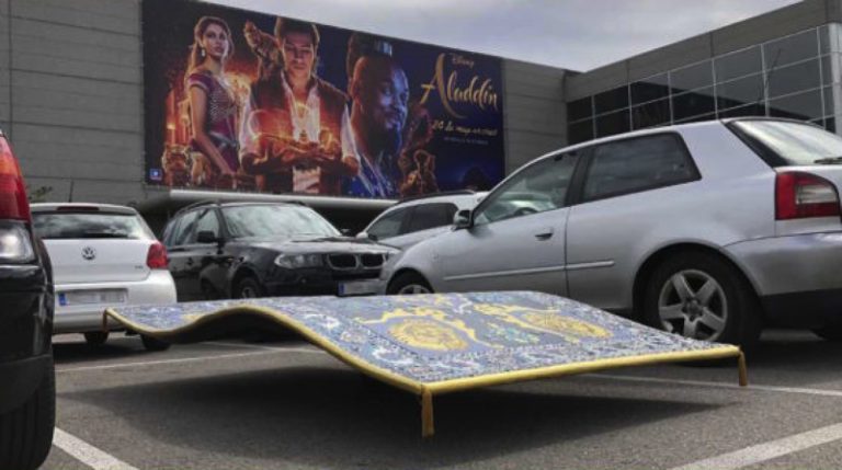 La divertida acción de ambient se llevó a cabo en un cine de Madrid donde los clientes se encontraron con una sorpresa en el parking: el protagonista de la película había dejado allí aparcada su alfombra voladora.