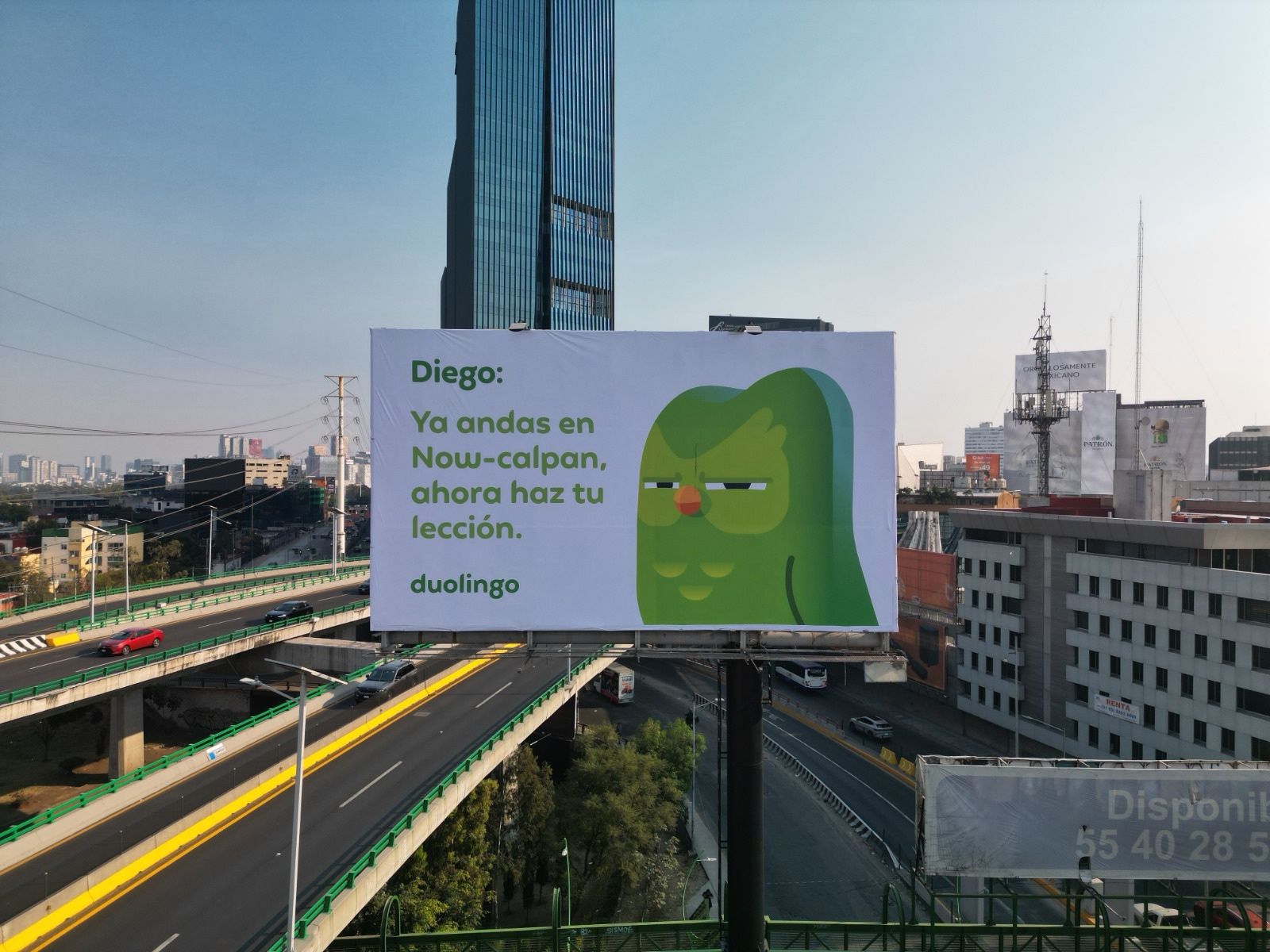 “Nuestra última campaña para Duolingo En español, Duolingo Is Watching, hace lo que mejor sabe hacer Duo: meterse en tu vida… Después, los llevamos a carteleras y a una activación en tiempo real donde cualquiera podía verse ahí”, comentó el fundador de la agencia a cargo de la campaña en LinkedIn.