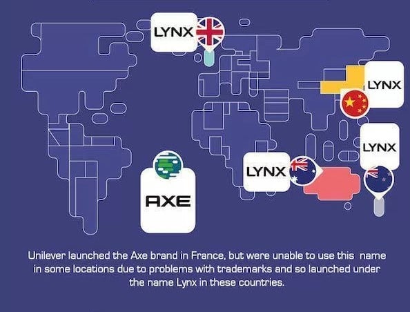 La empresa Unilever fundó la marca Axe en Francia en 1983, después de dos años, decidió expandirla al resto de Europa y demás países. Sin embargo, la palabra Axe en el Reino Unido, ya estaba registrada por otra empresa; además el nombre era considerado un poco agresivo para el mercado inglés, ya que su significado refería a la palabra hacha en ese idioma. Por ello, Unilever, creó el nombre de “Lynx”, el cual se emplea también en países como Nueva Zelanda, Australia e Irlanda.