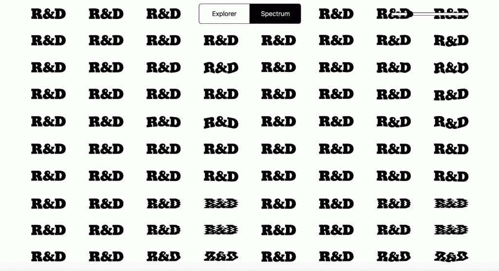 El logo, en líneas generales, está constituido por las sigas de la oficina (R&D) en blanco sobre negro, y las líneas de las letras, hechas originalmente en tipografía Karnak Black, son las que dialogan y varían en función de los datos aportados, gracias a un algoritmo especialmente formulado.