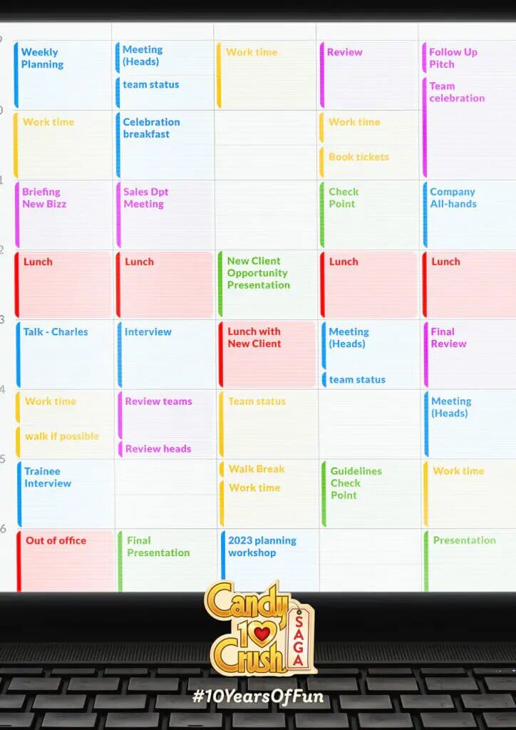 King, el desarrollador de uno de los juegos más populares del mundo, contrató a la agencia de publicidad David Madrid para celebrar el juego Match-3 en su décimo aniversario. Así, la agencia decidió crear una serie de anuncios gráficos que ilustran varias situaciones cotidianas en las que parecen aparecer los patrones que se ven en Candy Crush, desde casilleros de gimnasio hasta filas de bolas de bolos, puestos de flores y una hoja de cálculo de oficina.
