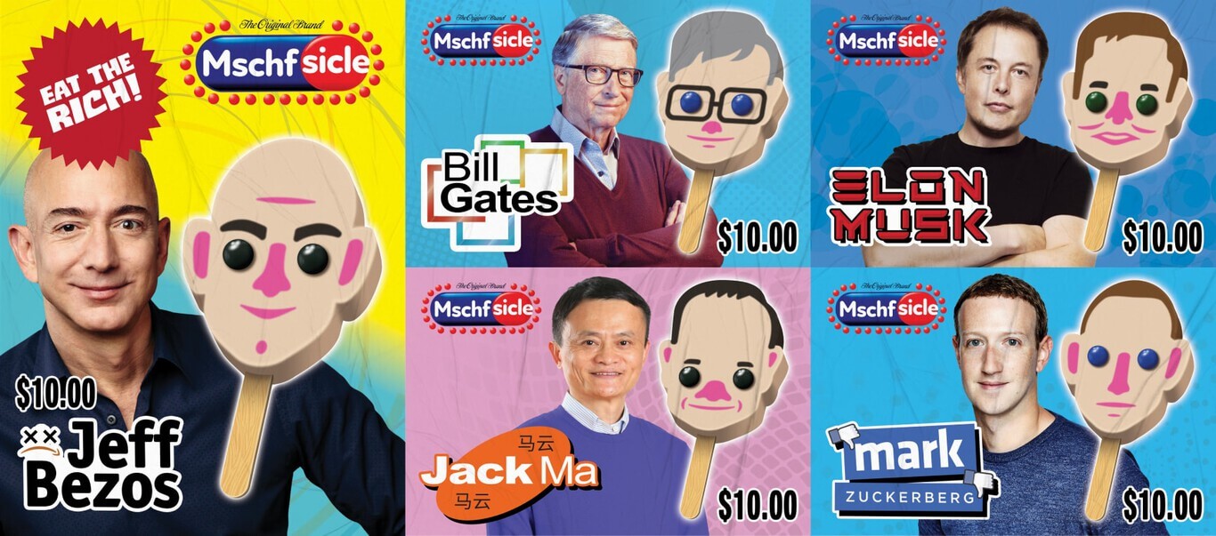 La gama completa de helados está compuesta por Elon Musk (Tesla), Jeff Bezos (fundador de Amazon), Bill Gates (creador de Microsoft), Mark Zuckerberg (Facebook/Meta) y Jack Ma (fundador de Alibaba). Cada helado indicaba las calorías que se ingieren por devorar a uno de estos millonarios junto con las astronómicas cifras de las fortunas que poseen.