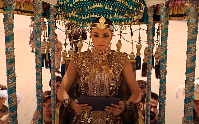 En el caso de Cleopatra, ya no cuenta con el carácter de una gobernante egipcia que en otrora mostraba a su público, en su nueva interpretación es conmovida por la infelicidad de sus súbditos para dejar de ser transportada por ellos en medio del desierto, y utilizar un transporte que ella misma es capaz de manejar.